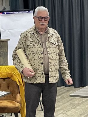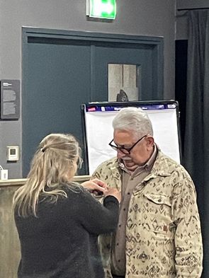Een mooi en een beetje plechtig moment van de vergadering was de ‘onthulling’ dat Fer niet alleen al 40 jaar lid is, maar daarvan ook 24 jaar in het bestuur heeft gezeten! Trouw wordt beloond: Fer kreeg een mooie decoratie opgespeld en lovende woorden, een boeket, een goed glas wijn. Misschien was hij toch een beetje verlegen...
